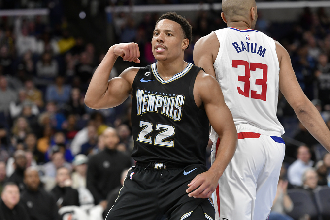 吉祥坊孟菲斯灰熊队的德斯蒙德·贝恩在对阵洛杉矶快船队的比赛中观看比赛