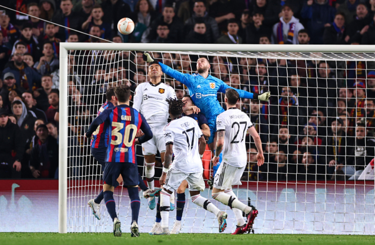 曼联门将大卫·德赫亚在巴塞罗那与曼联的欧罗巴联赛附加赛中击球。