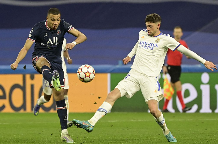 吉祥坊巴黎圣日耳曼队的基利安·姆巴佩在欧冠 16 强对阵皇家马德里的比赛中抢到了球。